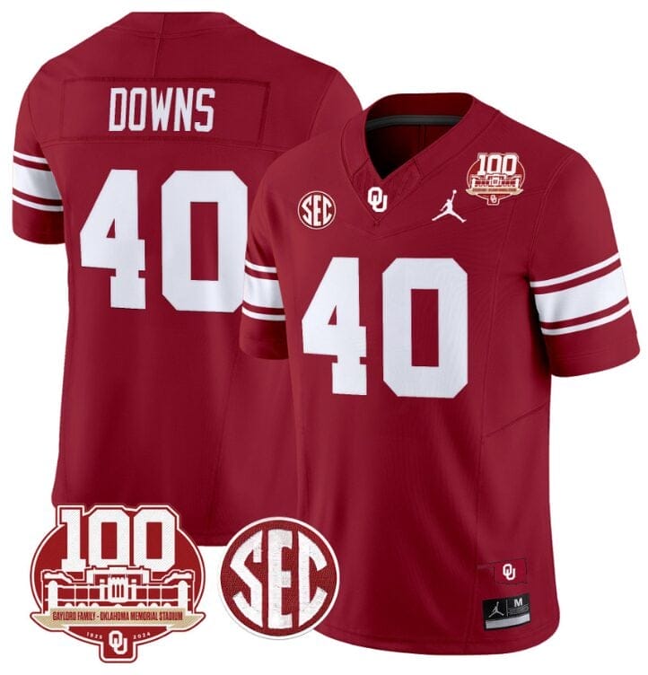 The Ethan Downs Jersey #40 Oklahoma Sooners 100th Anniversary Patch Vapor Limited College Football Stitched Crimson stands out with its striking design and top-notch features. Made from high-quality, breathable fabric, it promises comfort whether you’re in the stands or watching at home.