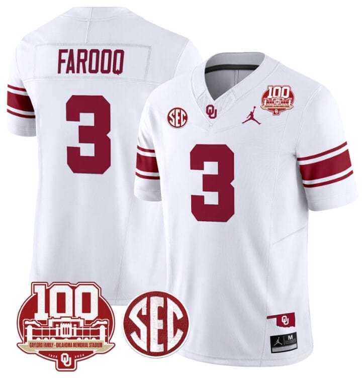 - Yes, the Jalil Farooq Jersey #3 Oklahoma Sooners 100th Anniversary Patch Vapor Limited College Football Stitched White is imported and crafted with attention to detail to ensure top-notch quality.
