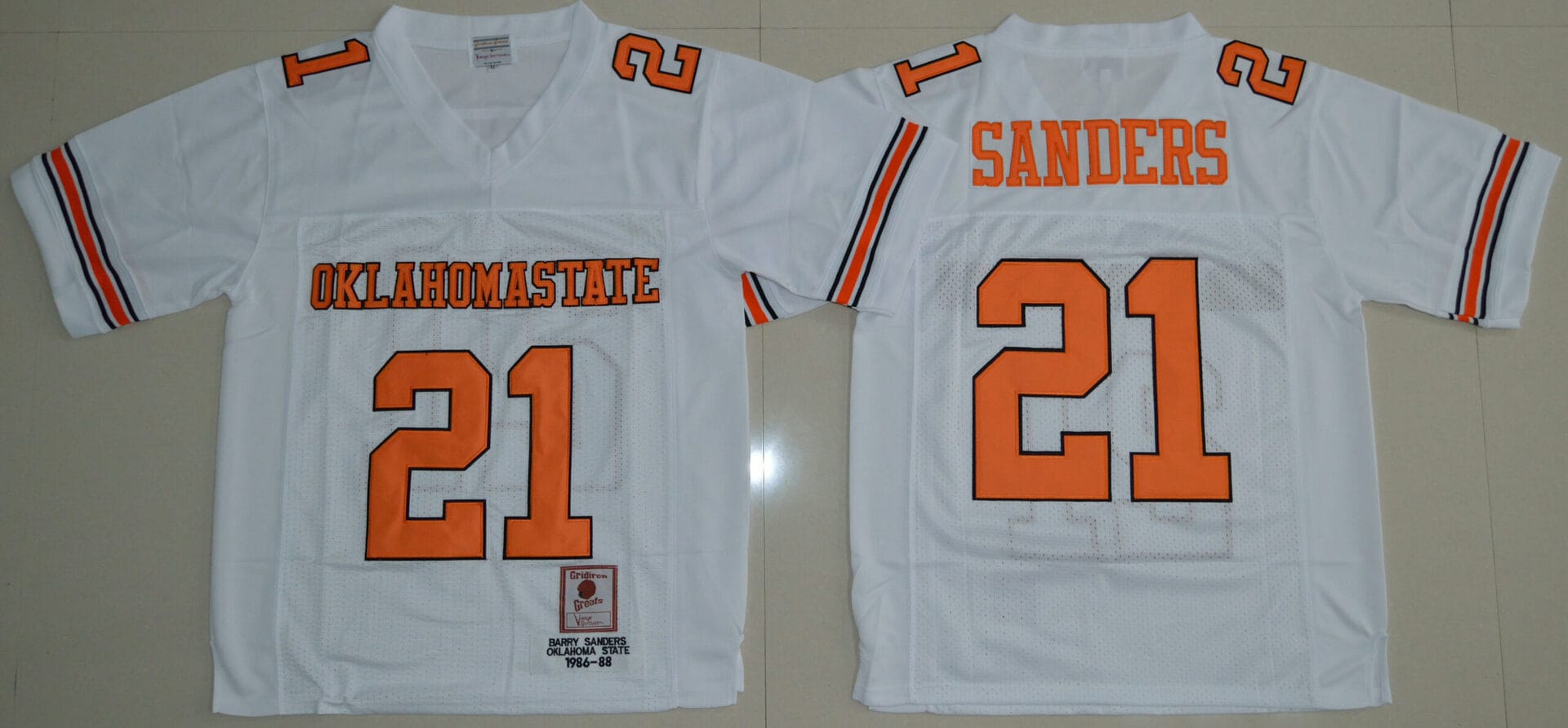 Celebrate your football fandom with this ncaa football jersey ! This Oklahoma State Cowboys #21 Barry Sanders Football Jersey White and Orange is available in various size men, women and youth and features a combination of stitched-embroidery. You’ll look just like your favorite ncaa football players when you rock this ncaa football jersey!