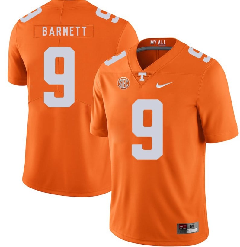 Celebrate your football fandom with this ncaa football jersey ! This Tennessee Volunteers Dereck Barnett Jersey #9 Football NCAA Jerseys Orange is available in various size men, women and youth and features a combination of stitched-embroidery. You’ll look just like your favorite ncaa football players when you rock this ncaa football jersey!