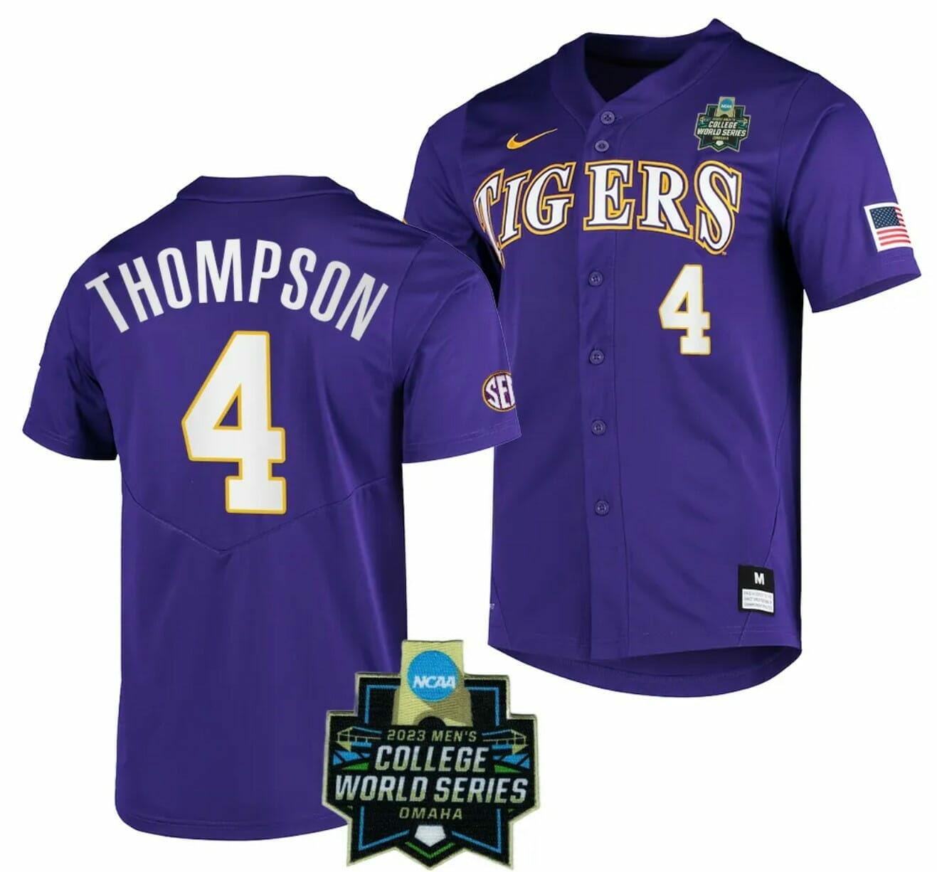 So, what are you waiting for? Shop now and get your hands on the Jordan Thompson Jersey LSU Tigers Baseball NCAA 2023 College World Series Purple #4. Wear it with pride, showcase your love for the team, and become a part of the LSU Tigers legacy. Order today and experience the thrill of being a true fan!